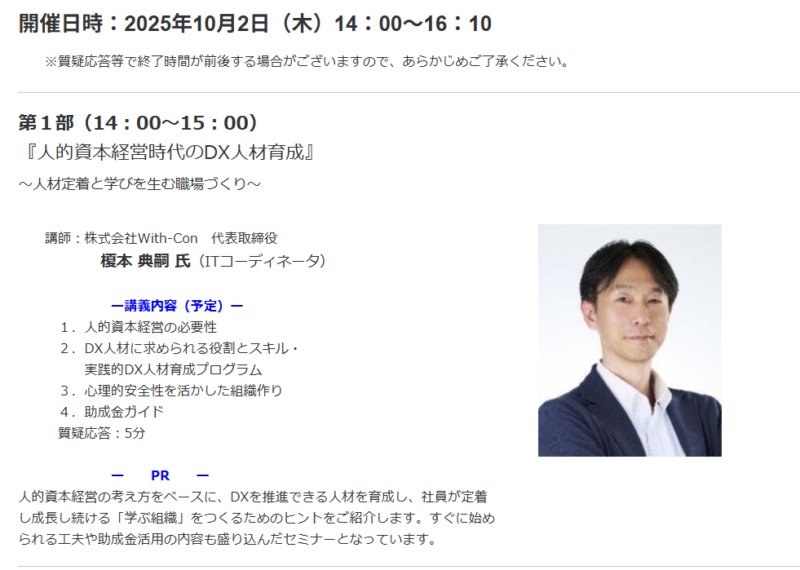 2025年10月2日、「人的資本経営時代のDX人材育成~人手不足時代に”学ぶ組織”を作る~」をテーマにセミナーを開催いたしました。本記事では、セミナーの概要をご紹介します。